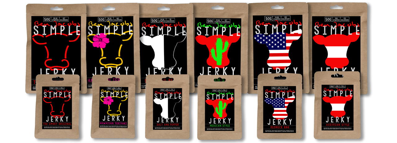 In unserem Shop bieten wir 11 verschiedene Sorten an: Von traditionell-amerikanischen Gewürzmischungen bis zu europäisch-angehauchten Zubereitungen. Hier gibt es alles, was das Jerky-Herz begehrt.