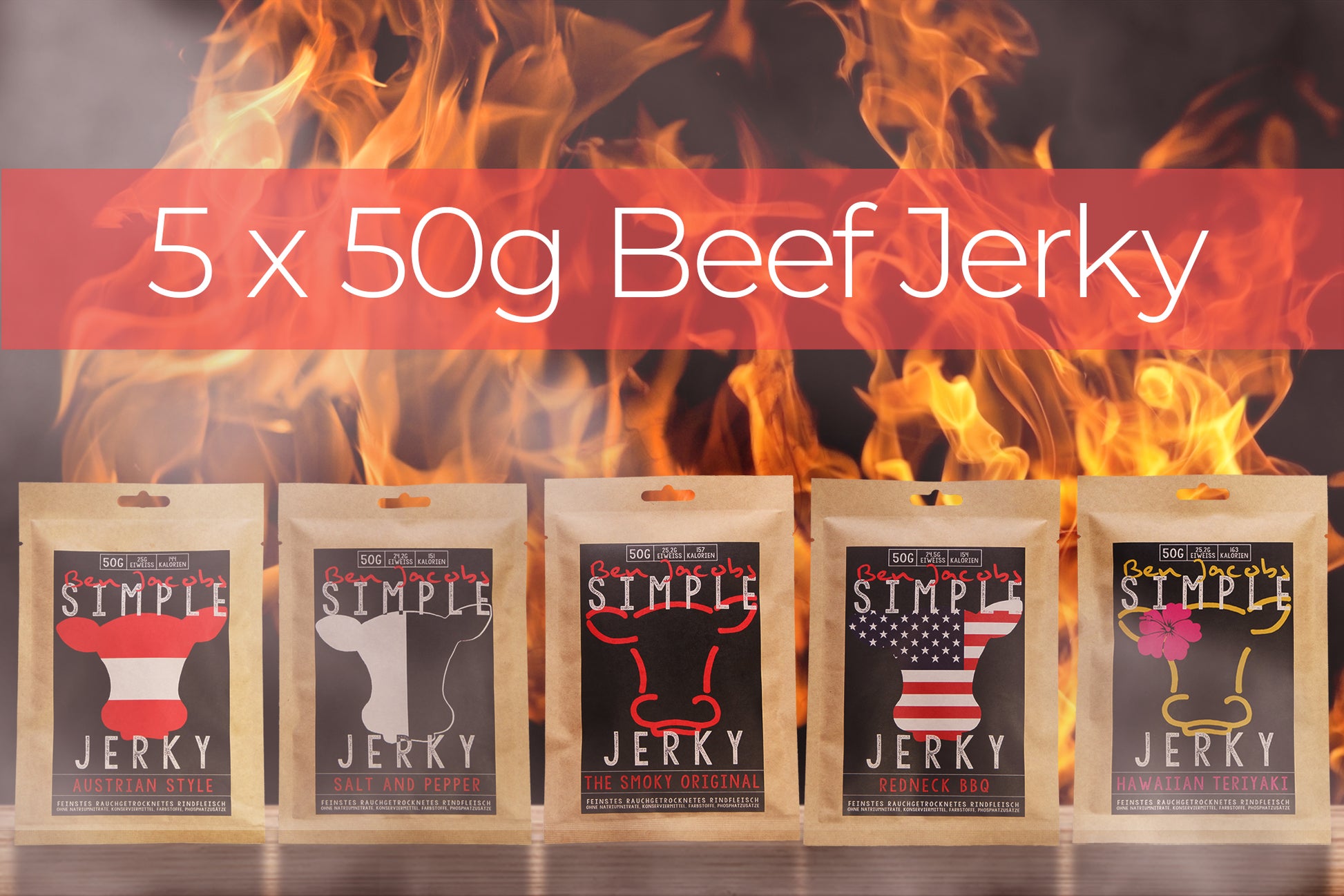 Unsere Sample Box enthält alle köstlichen Beef Jerky Zubereitungen in einer Bestellung! Die Sample Box ist nicht nur perfekt zum Durchprobieren, sondern auch das ideale Geschenk für jeden Beef Jerky-Liebhaber - mehr Jerky-Genuss geht nicht!